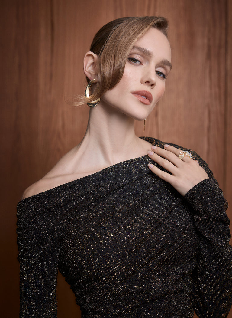 Quand vous accueillez les invités, faites le service et menez le décompte jusqu’à minuit, le confort devient indispensable — sans jamais renoncer à l’allure. La robe longue en maille métallisée coche toutes les cases : assez spectaculaire pour marquer les esprits, assez fluide pour suivre le rythme. Ses fronces, sa longueur dramatique et son épaule dégagée ajoutent juste ce qu’il faut de chic et de nonchalant. L’art de tout gérer, sans rien céder au style.