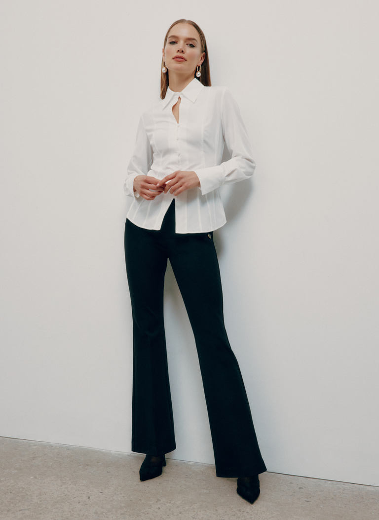 If you’re all about shape, incorporating a bell-bottom pant into your wardrobe is a great way to accentuate your legs while blending modern and retro aesthetics. Try wearing this look with a sheer long-sleeve top on a night out, or pair it with a tweed blazer or tailored button-down shirt and pearl accessories—think drop earrings or a chunky necklace—for something sharp and elegant.