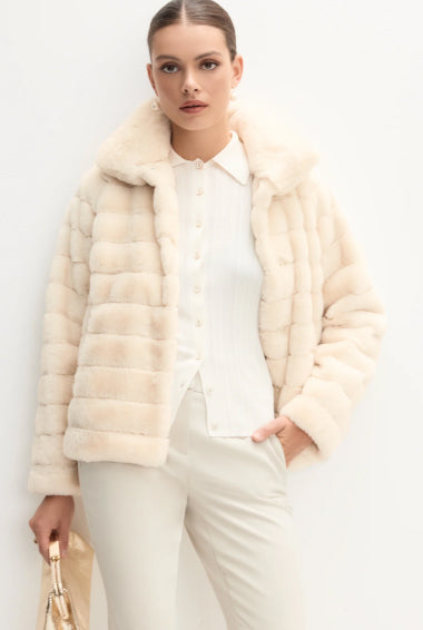 Featuring a notched collar and cropped, ribbed design, our beige faux-fur coat goes especially well over a sequin dress, making it the must-have addition to your holiday wardrobe. Wear yours with shimmery drop earrings for that extra element of drama.